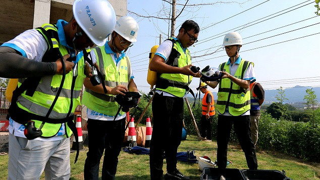 佩戴正壓式呼吸器準備進入管廊內救援